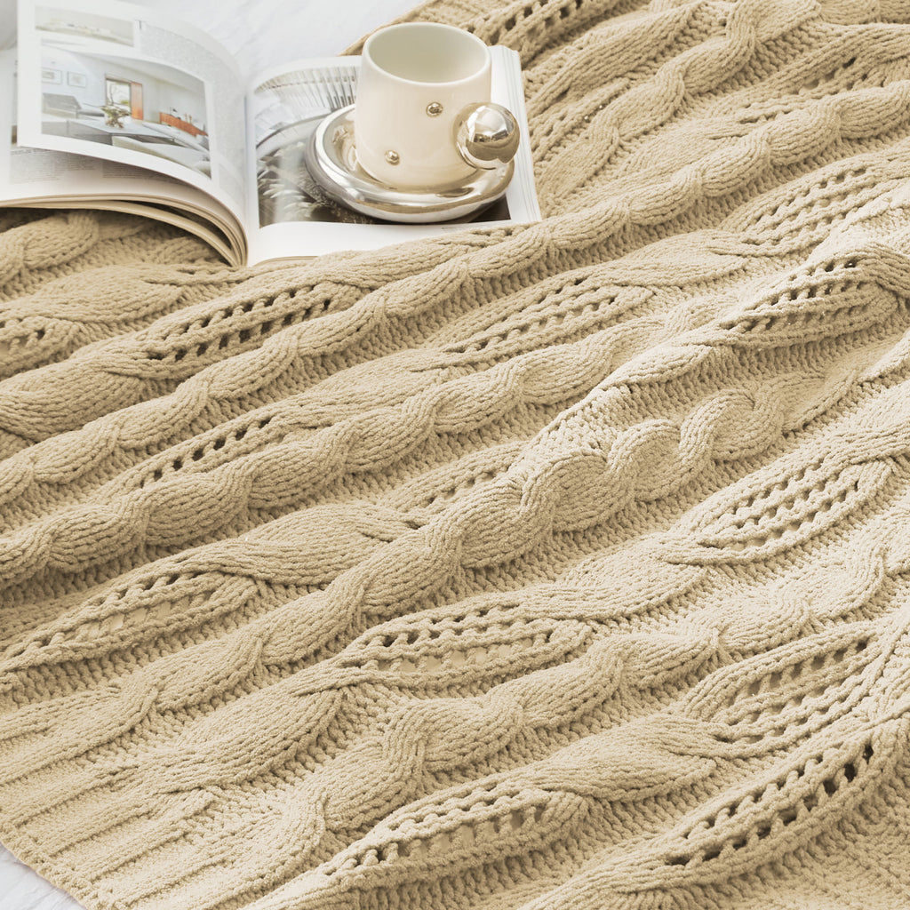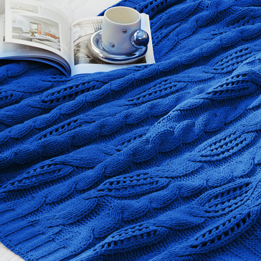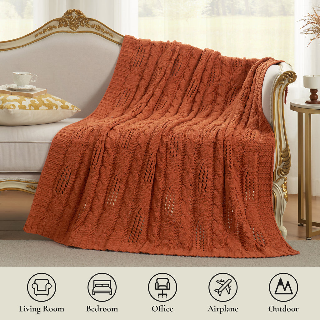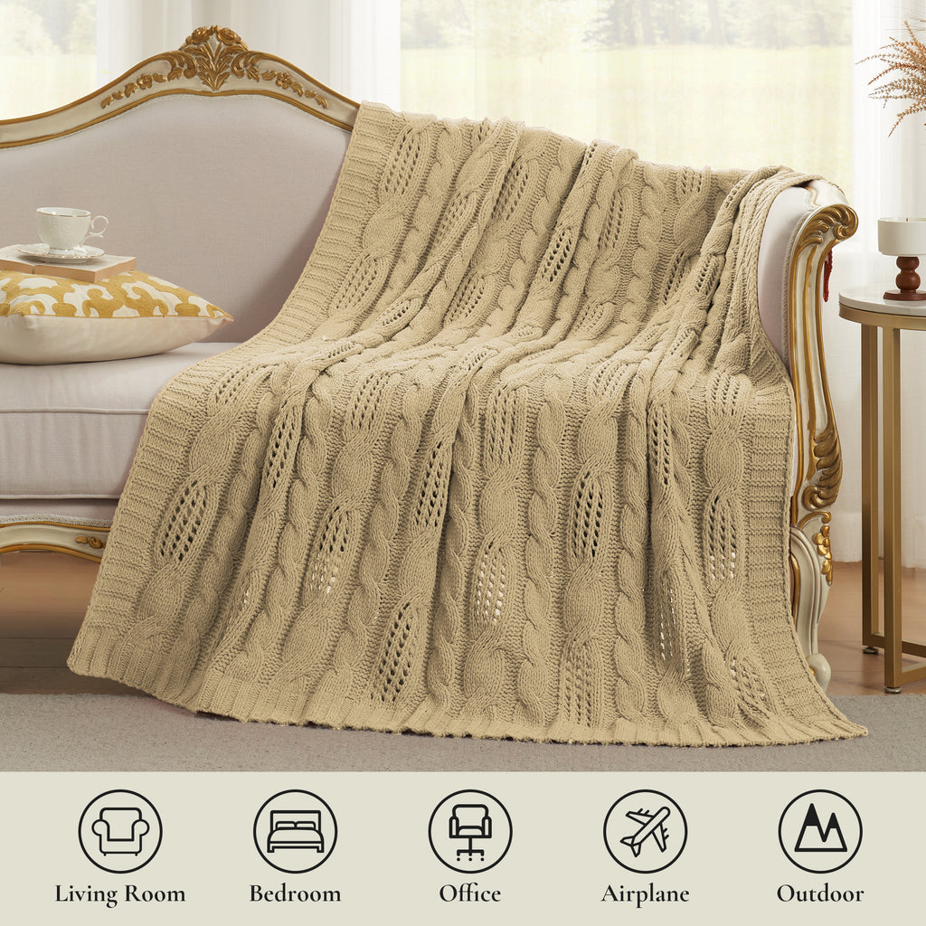 - Elegant Hollow Cable Knit Design: Adorned with an exquisitely detailed hollow cable knit pattern, this knit throw blanket adds a touch of elegance and sophistication to any living space.