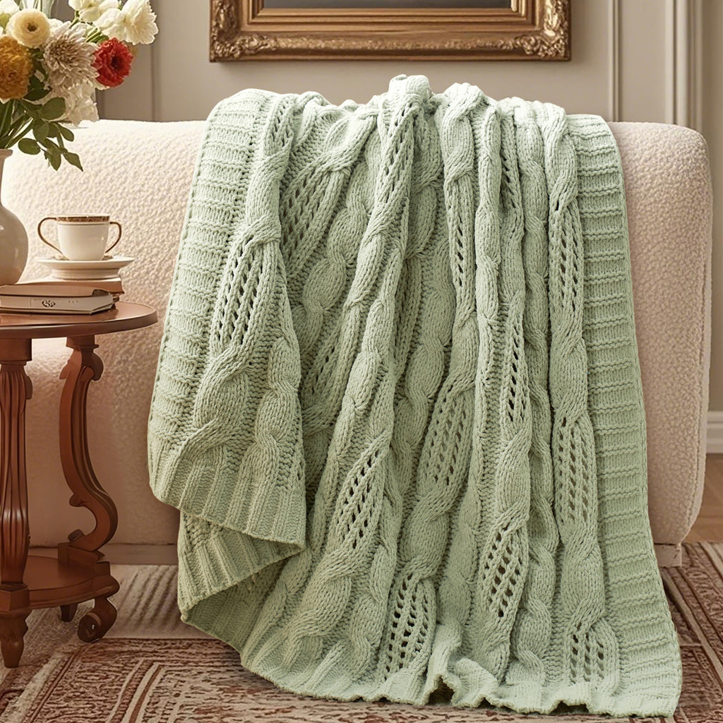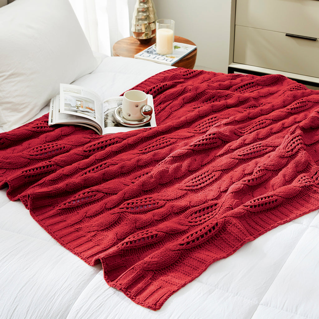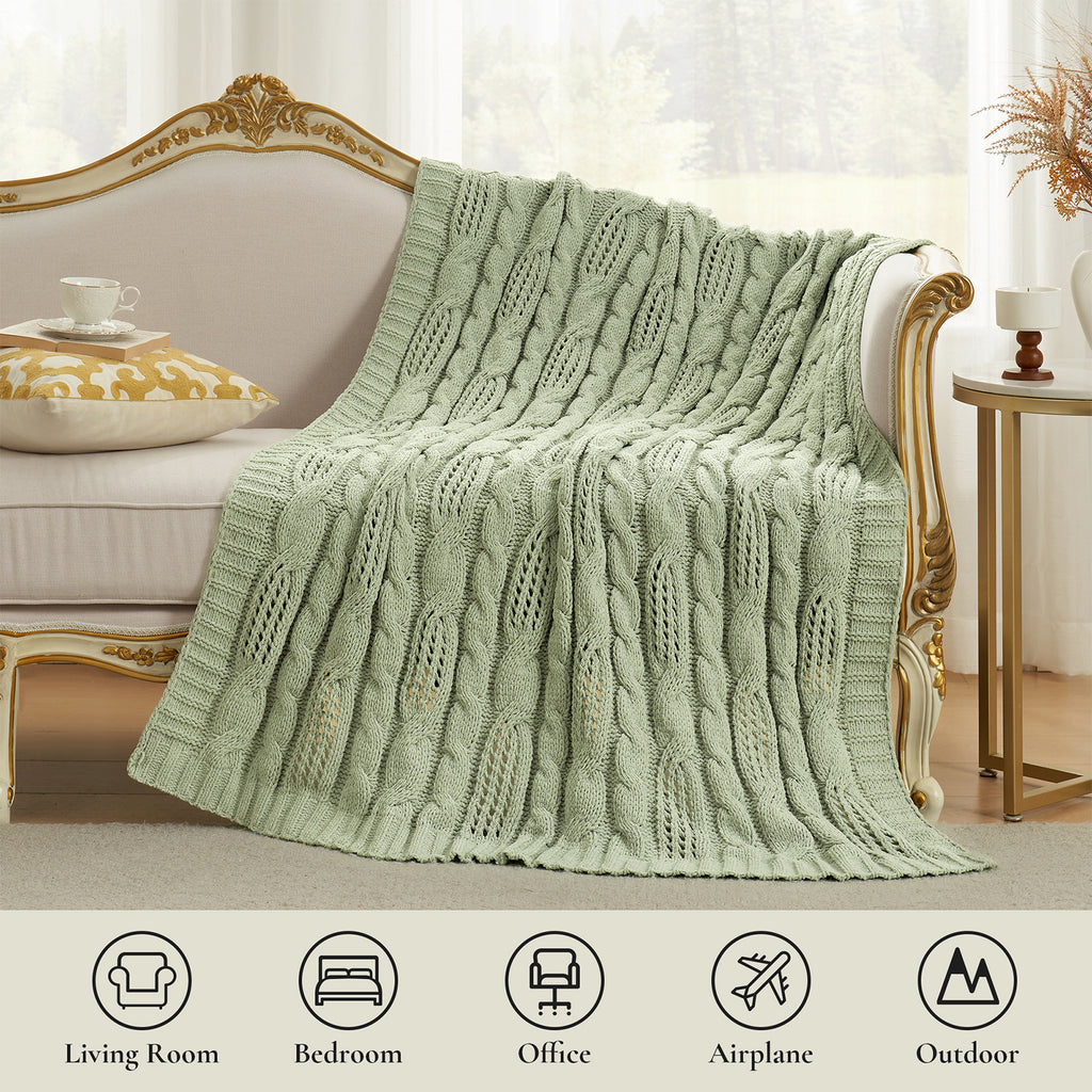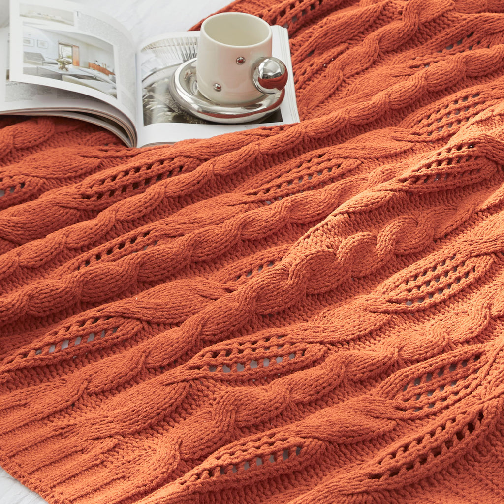 - Elegant Hollow Cable Knit Design: Adorned with an exquisitely detailed hollow cable knit pattern, this knit throw blanket adds a touch of elegance and sophistication to any living space.
