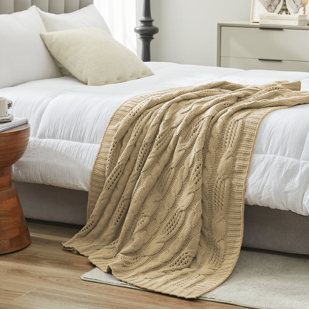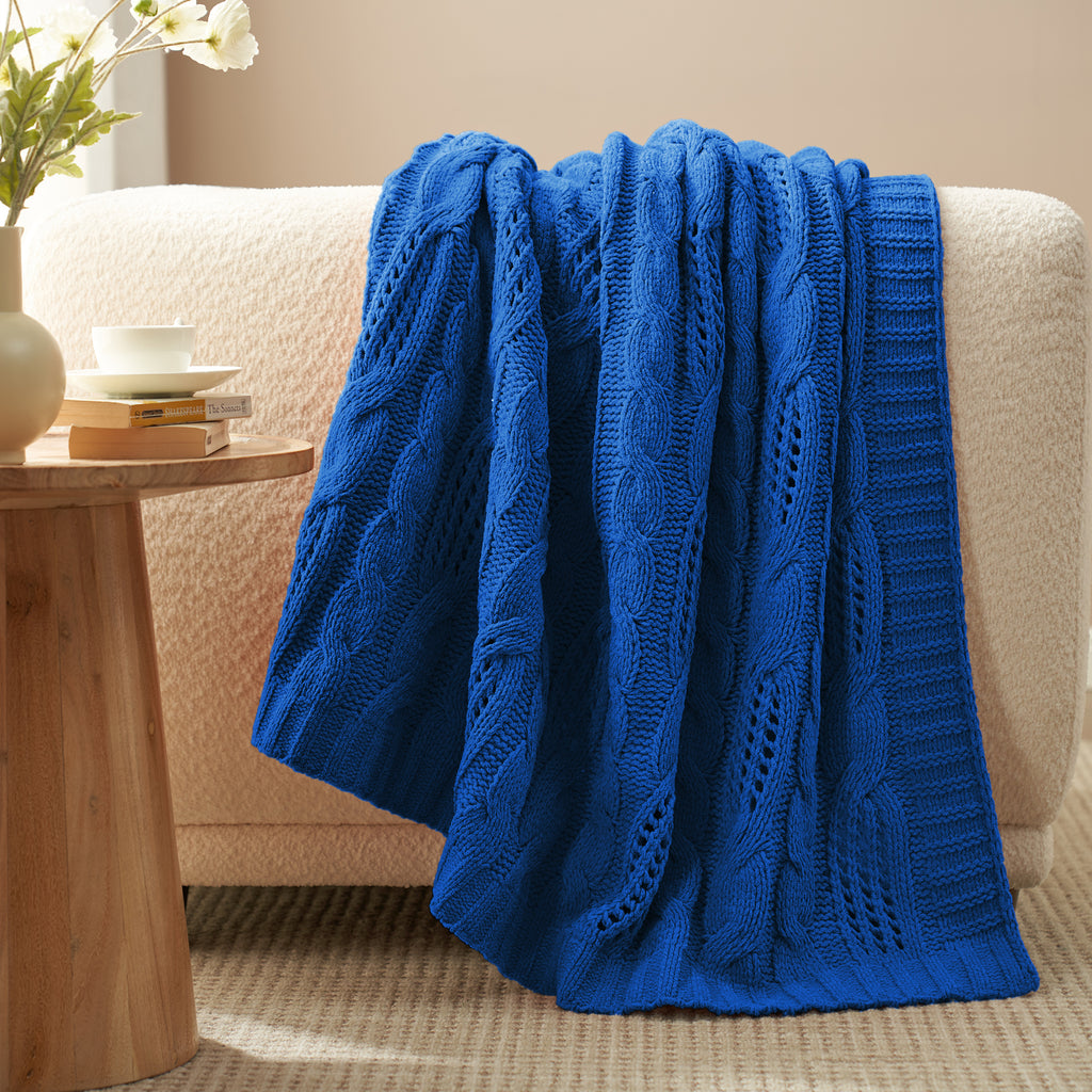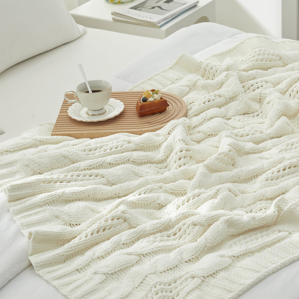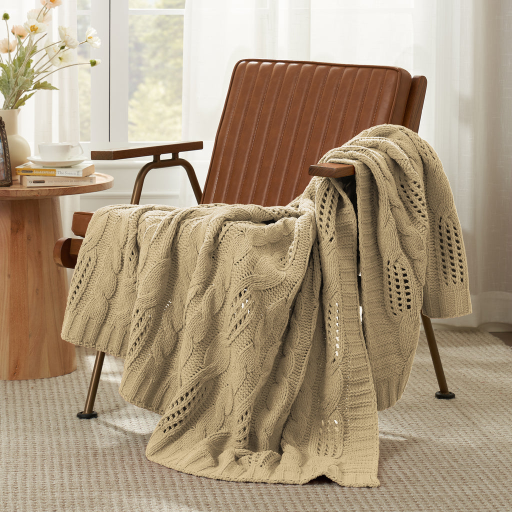 - Elegant Hollow Cable Knit Design: Adorned with an exquisitely detailed hollow cable knit pattern, this knit throw blanket adds a touch of elegance and sophistication to any living space.