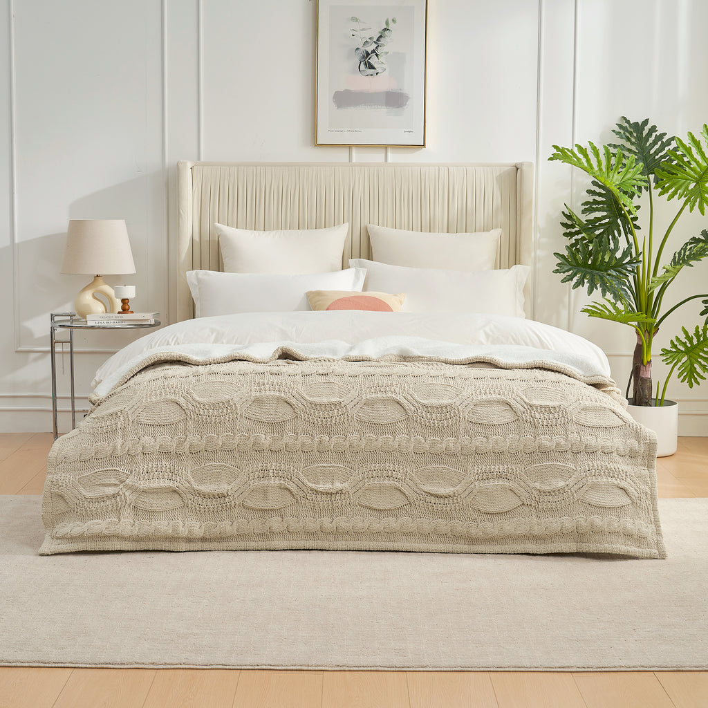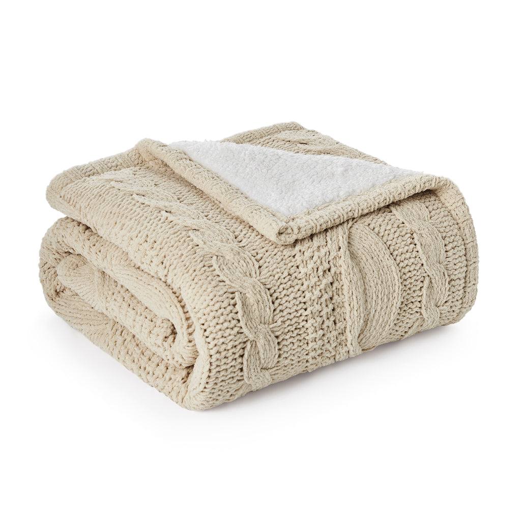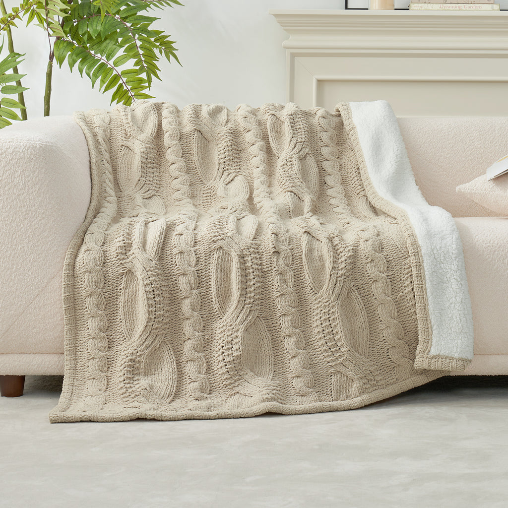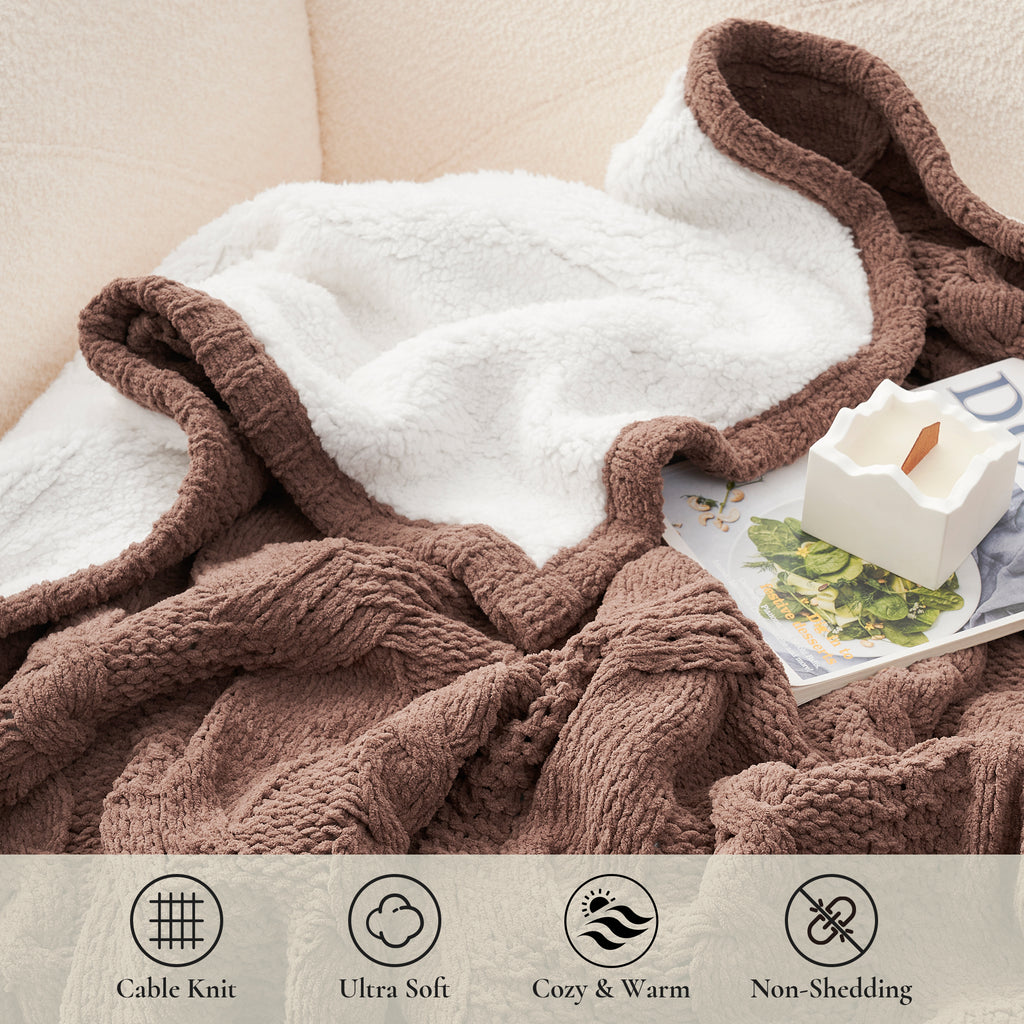 - PREMIUM MATERIALS: Crafted from chenille yarn on one side, with a 100% polyester sherpa reverse (240gsm), this cable knitted sherpa throw blanket provides a soft hand feel and durability. It's not only warm and cozy but also easy to maintain. For best results, wash in cold water with a gentle detergent and tumble dry on low heat (do not iron).